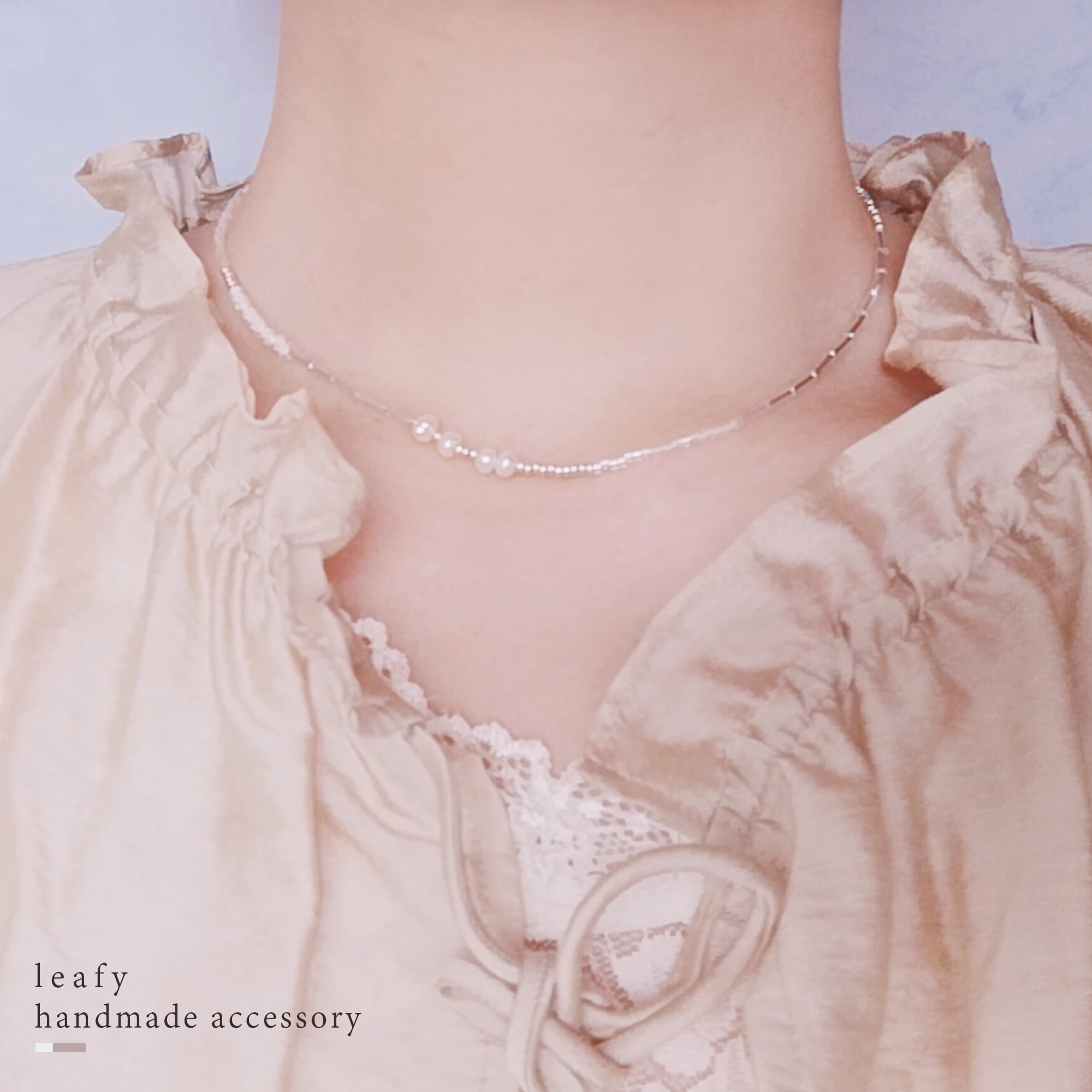 小さめの淡水パールとクリアビーズを不揃いに合わせて、透明感のある大人なビーズネックレスに仕上げています。