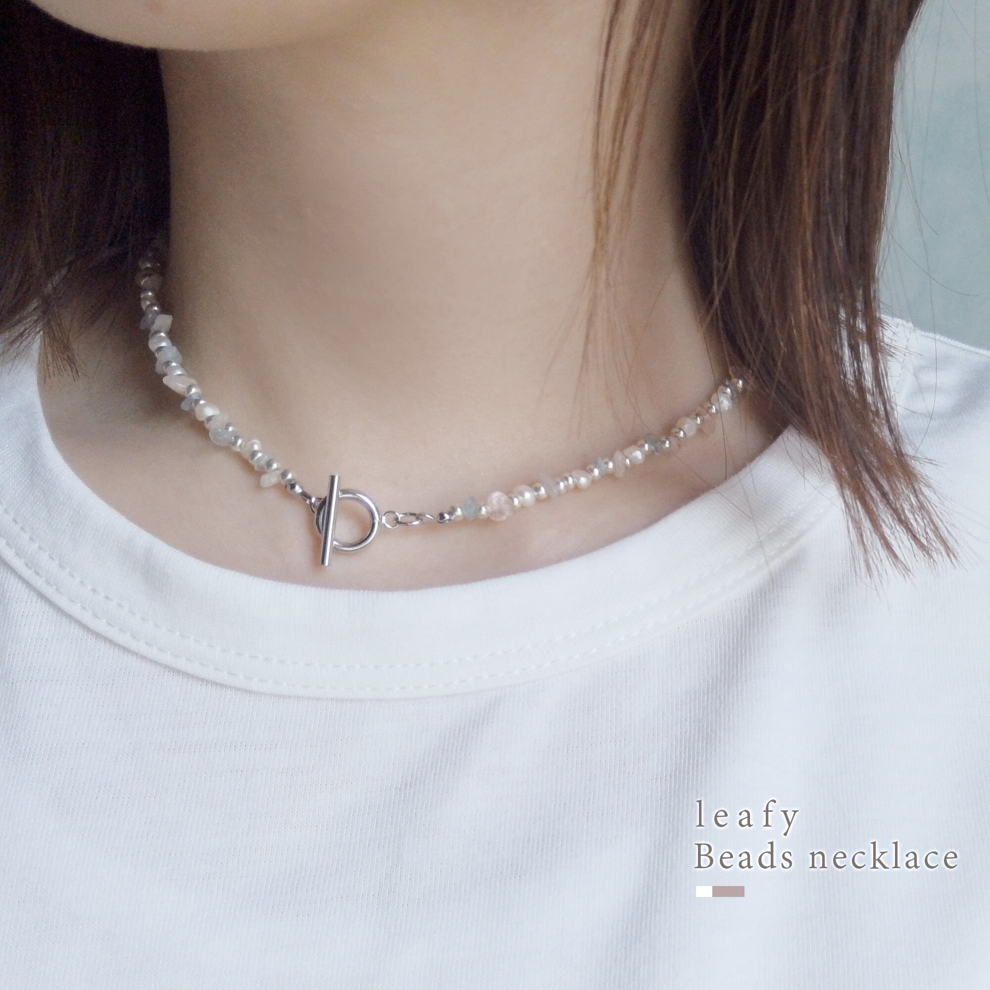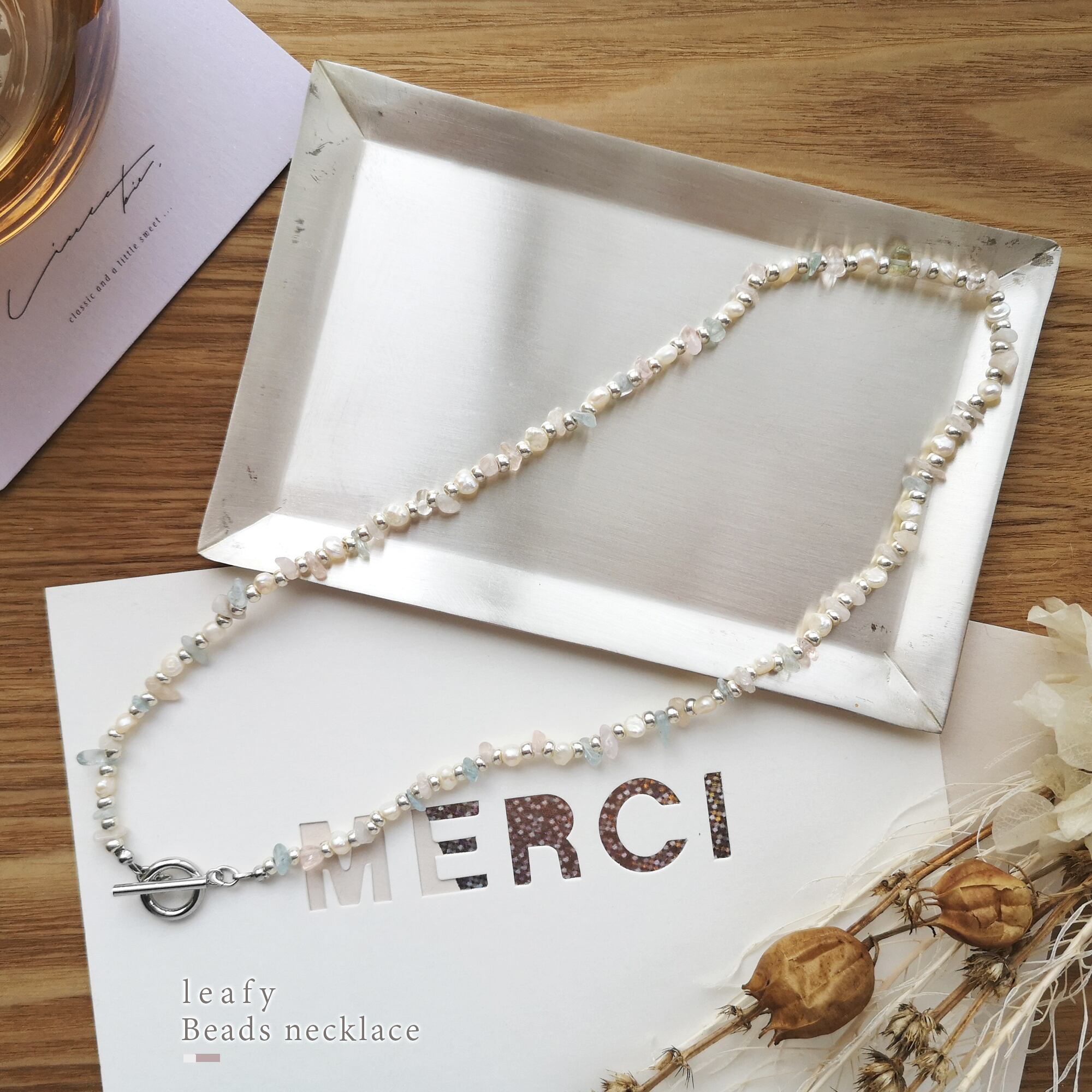 小粒な淡水パールと淡色のアソートストーンを合わせた、ほんわかとした優しい色合いのマンテルネックレスです。