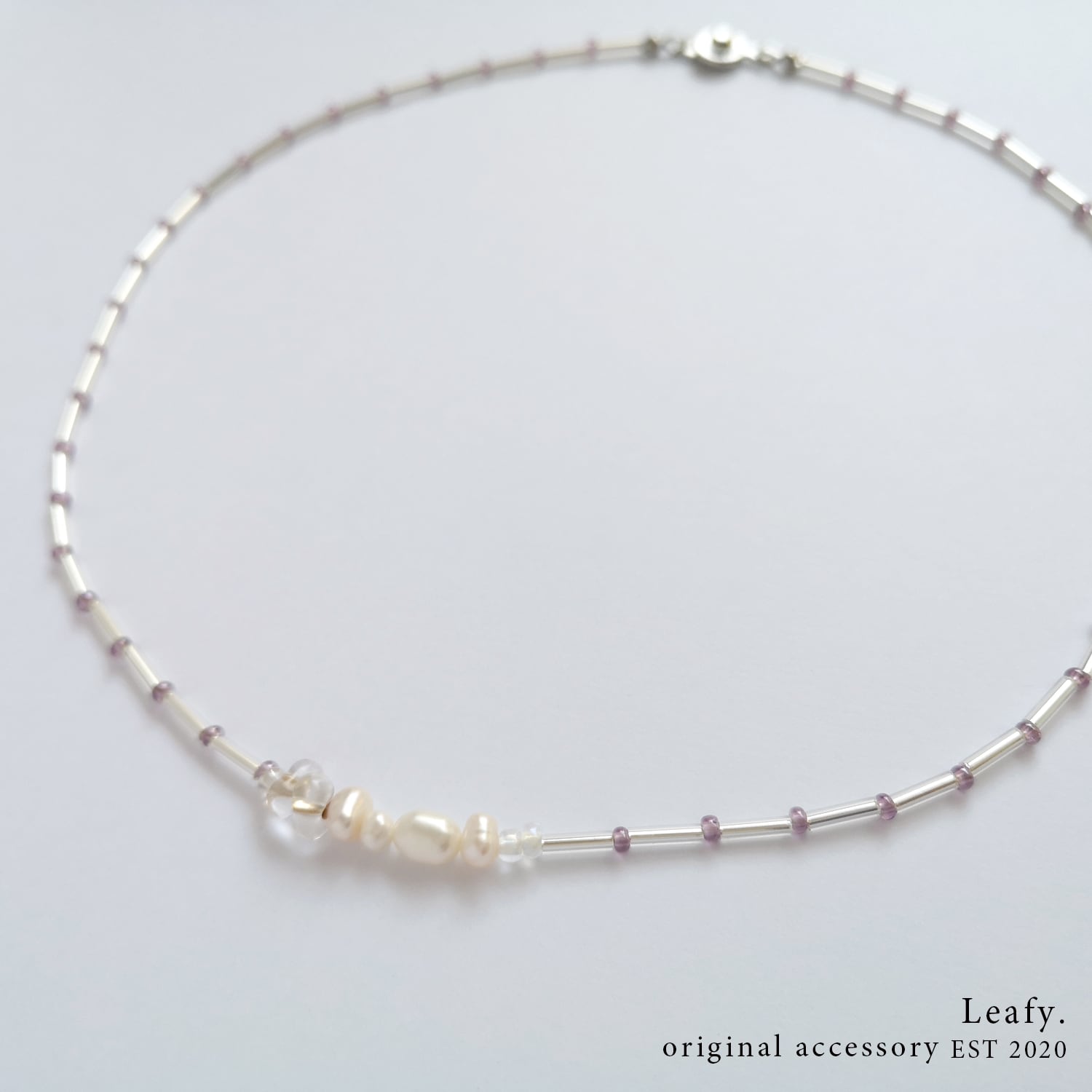 パープル色のビーズと形の違う透明ビーズが首元をさわやかに彩ります。